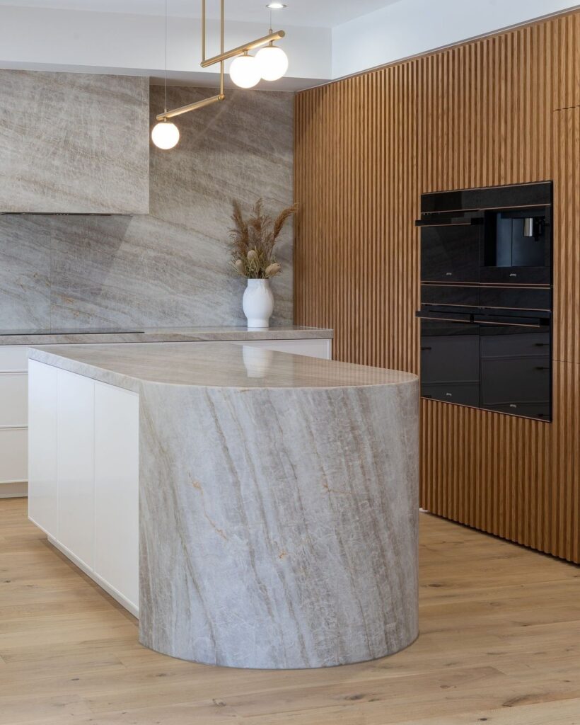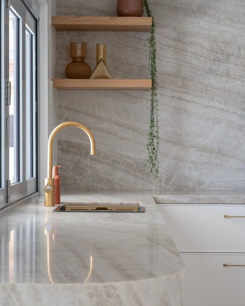 Taj Majal es una cuarcita beige claro. Su base en tenues tonos crema, la surcan vetas lineales de color gris de intensidad variada. Disponible en terminación pulida y leather