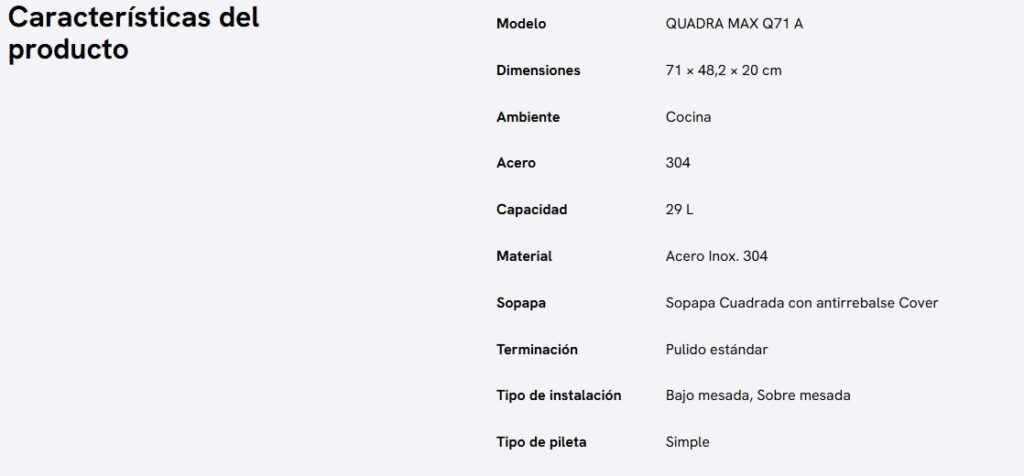 La pileta Quadra Max Q71 A de Johnson Acero está fabricada en acero inoxidable, garantizando alta resistencia a la corrosión y durabilidad. Sus dimensiones generosas ofrecen un amplio espacio para tus necesidades culinarias. Diseñada para instalación sobre mesada, su radio de curvatura optimiza el aprovechamiento del espacio interior, permitiendo un escurrimiento eficiente del agua. Su acabado pulido estándar aporta un brillo elegante y facilita la limpieza, adaptándose a diferentes estilos de cocina.