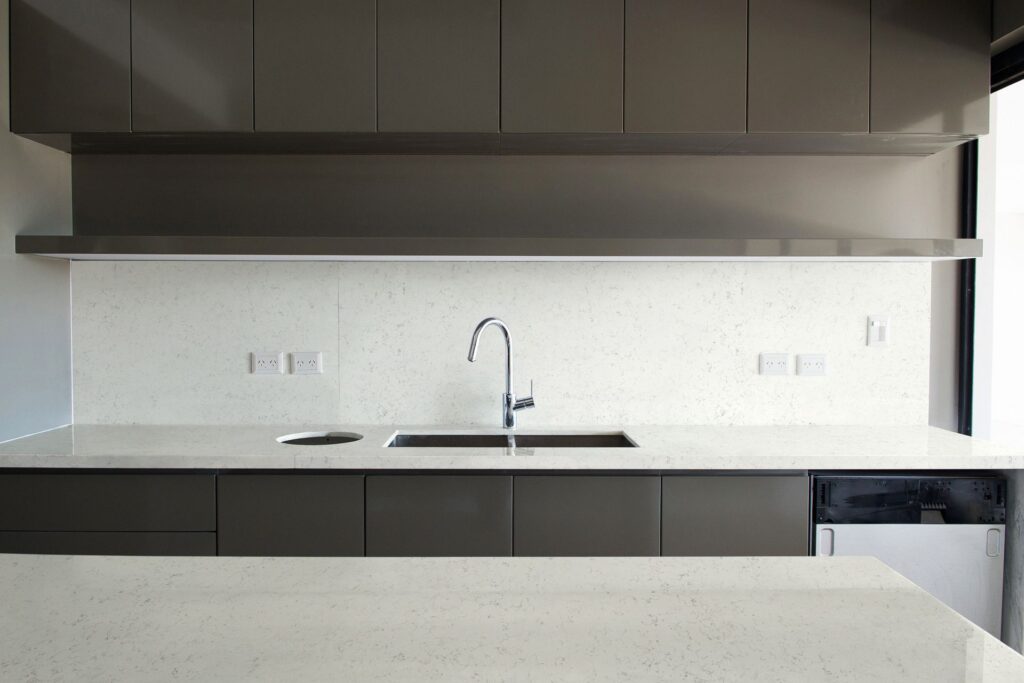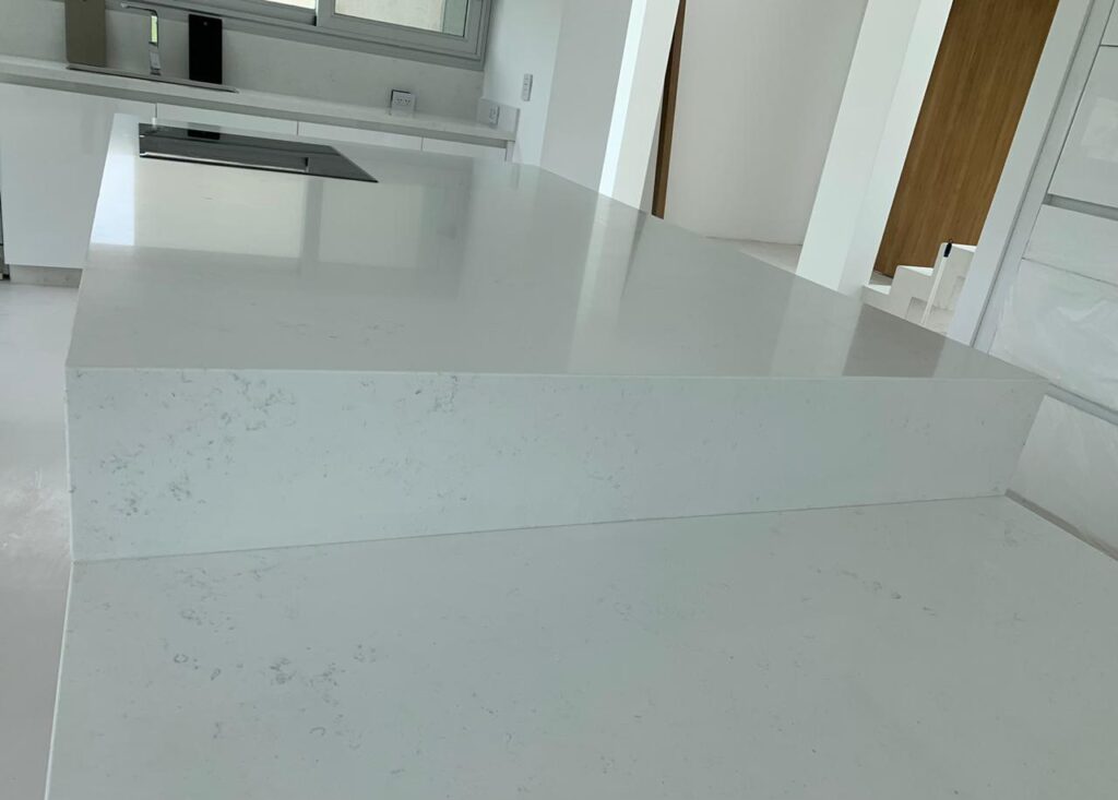 Material de tonalidad blanca con delicadas vetas en gris claro que se despliegan de forma suave y equilibrada. Disponible en terminación pulida